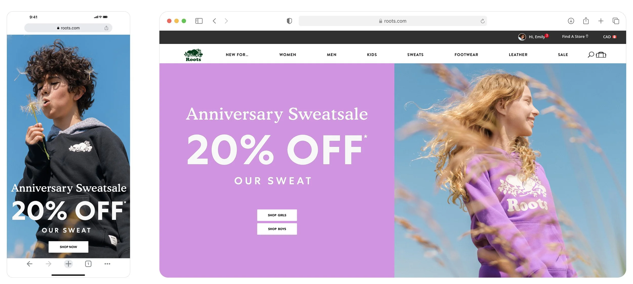 Seen: Roots.com, social channels, emails, in-store and window.